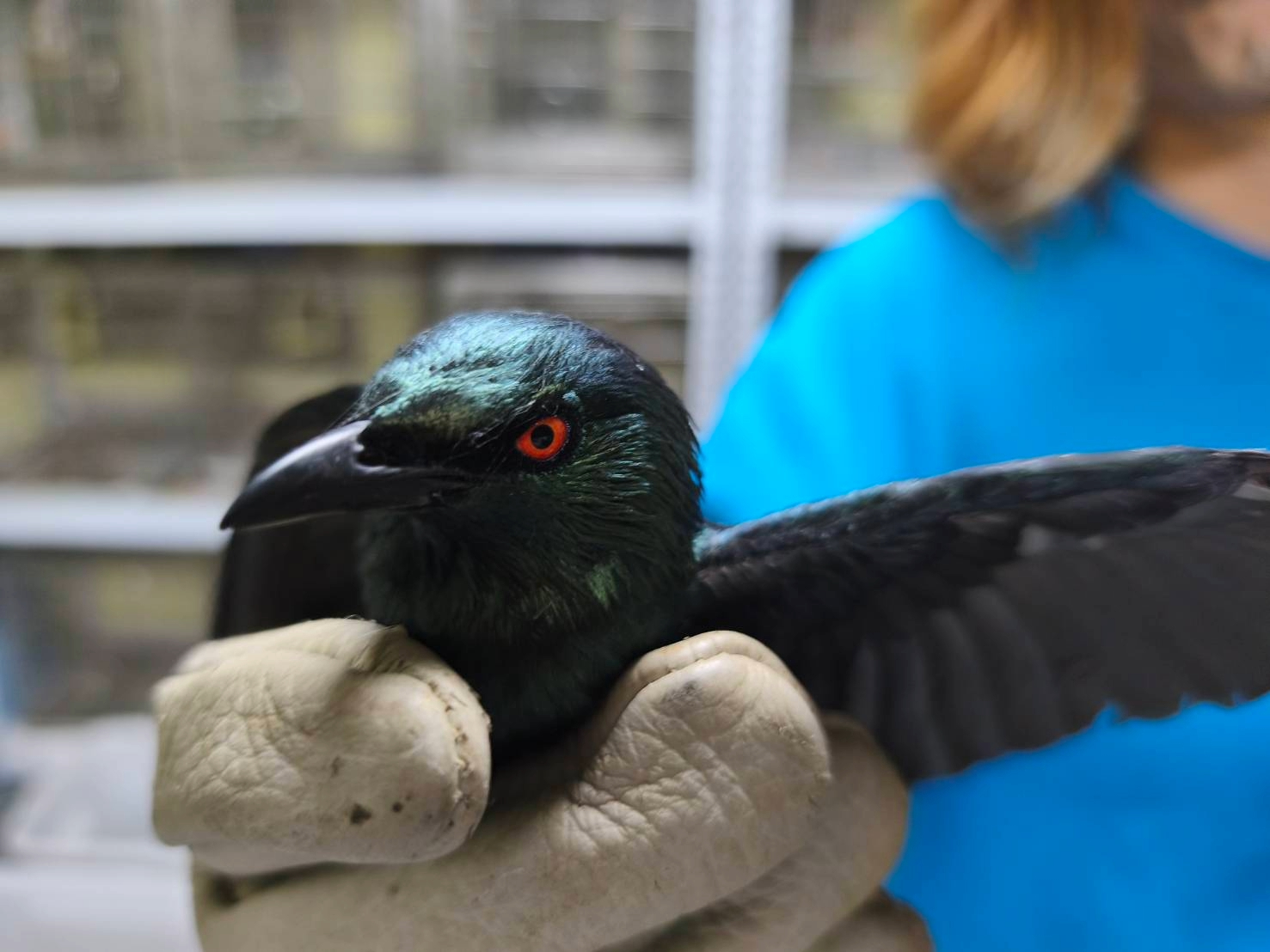 新北市政府動物保護防疫處近日接獲新莊區呂姓民眾通報,住家陽台玻璃護欄夾縫裡有1隻羽毛呈現閃亮墨綠光澤、眼睛散發詭異紅光的怪鳥,受困無法展翅脫身,嘴喙撞擊玻璃發出叩叩叩響亮聲音,全家人眼睜睜束手無策遂請求派人救援。八里動物之家動保員抵達現場後,使用安全夾具,毫髮無傷順利將這隻<紅眼怪鳥>從夾縫移出後,發現牠是台灣都會區常見外來種”亞洲輝椋鳥”。