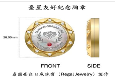 以「璀璨情誼・互惠共榮」為主題的「臺星友好紀念胸章」,由泰國臺商日成珠寶(Regal Jewelry)以精湛珠寶工藝細緻製作。