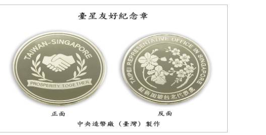紀念章正面以握手圖案象徵臺星兩國堅實情誼,背面結合臺灣國花梅花與新加坡國花卓錦萬代蘭,寓意兩國友誼歷久彌新、互惠共榮。紀念章採用鎳黃銅材質,重量25公克,直徑38毫米,最高鑄量為300枚,具高度紀念與收藏價值。