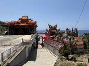 舢舨灣前仿金獅子號造型販賣點的後面,是洪義詳家族墓園,墓園前方為斷崖,落差10餘米,再緩坡到海邊做人工設施。墓園出水口被一莿竹叢掩住。有一次,萬將千歲來指示,祂南海巡狩回來發現,墓園擋土牆崩掉,要緊急處理。先求土地公符令安住土方,再擇吉日動工,修護擋土牆與出水口。莿竹叢掩住就鋪面,崩塌看不見,所幸萬將千歲茗茶,否則祖墳崩塌,後果不堪設想。