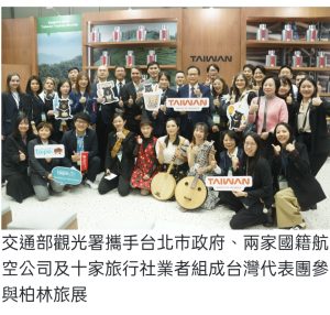 交通部觀光署於2026年3月3日至5日,再度偕同航空公司及旅行業等觀光產業組團參加全球規模最大的旅遊盛會「柏林旅展(ITB Berlin)」。本屆台灣館秉持台灣觀光3.0品牌「Taiwan, Waves of Wonder (台灣魅力·驚喜無限)」精神,以「台灣百味(百ways)」為核心,策畫「慢旅茶館」主題,結合精緻職人工藝,勾勒出台灣這一座不打烊的島嶼,從晨曦到深夜、24小時安全又便利、精彩且好玩的獨特優勢;在台灣,有多樣旅遊路線、多元文化與美食體驗,不論是自然、文化、城市或慢活,台灣都能提供世界級的深度旅遊體驗。此外,台灣觀光代表團並於3月2日赴法國巴黎舉辦觀光推廣會,透過雙方業者的商洽互動,展現積極拓展歐洲重點市場的決心。