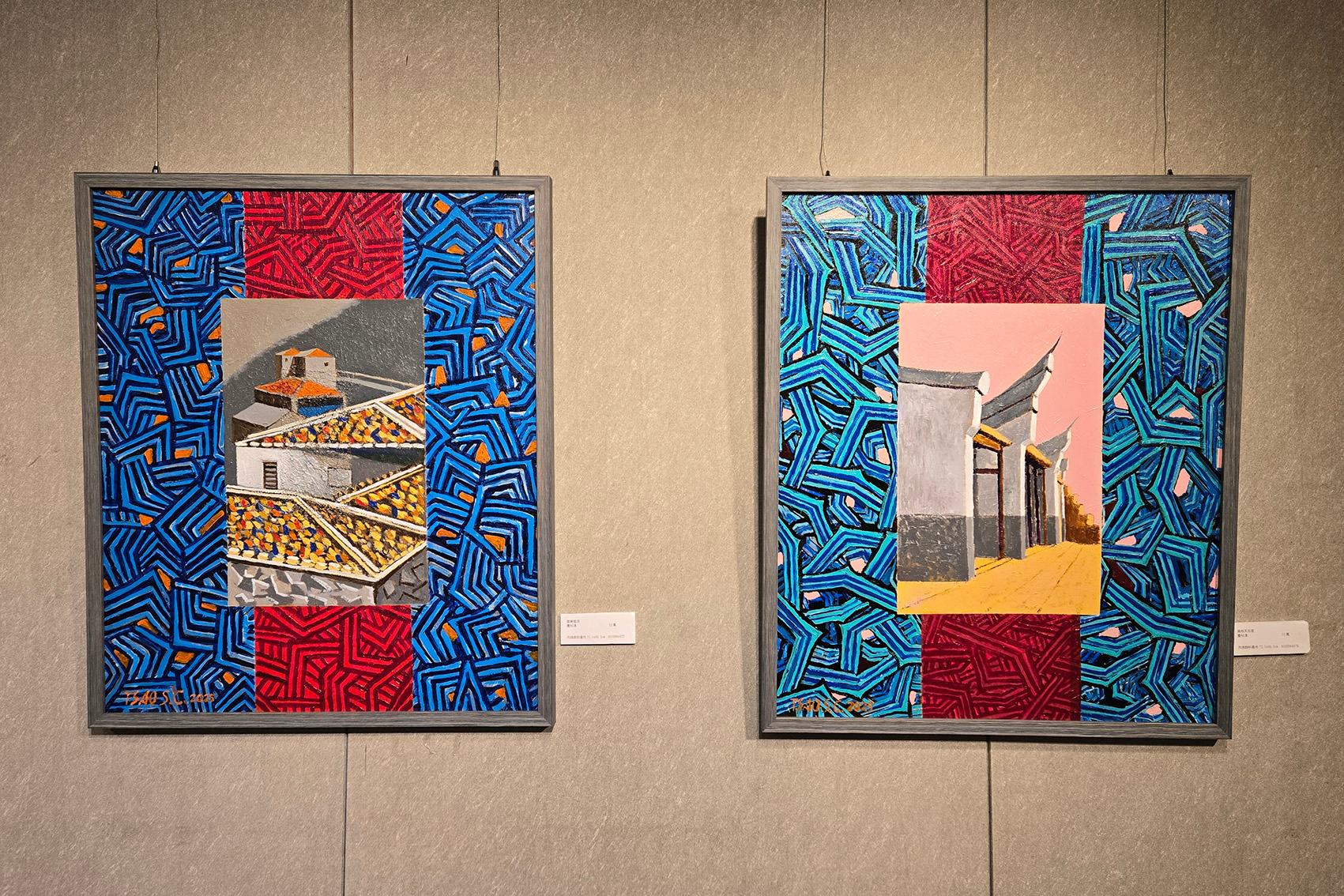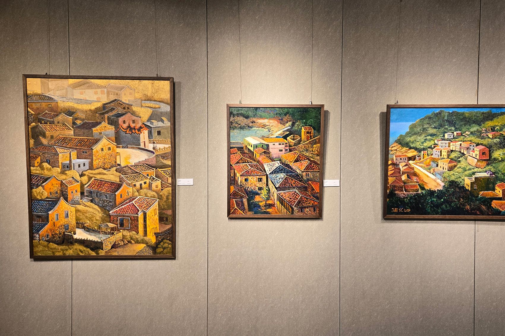 「藍眼淚」系列為展覽焦點之一,源自馬祖海域特有的生物發光奇景。藝術家以畫筆捕捉藍光閃爍於夜海、與船影交錯的瞬間,呈現出海的脈動與靈魂。他的創作本身不止於視覺呈現,更藉由詩意的構圖與光影節奏,引導觀者進入感性與理性的交會點。而「聚落」系列則轉向人文關懷,描繪馬祖古厝、蜿蜒巷弄與生活風景。畫中不僅有建築與光影,更承載兒時回憶與在地情感。