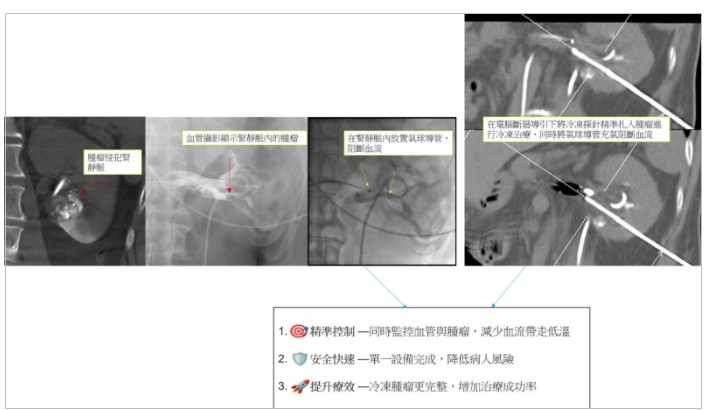 另一個應用的實例是一名52歲患者,右腎因腎細胞癌而切除,僅存的左腎又出現新的腎細胞癌,且已侵犯腎靜脈。在此情況下如進行腫瘤冷凍治療,腎靜脈的血流會將低溫帶走,使腫瘤降溫不足,進而影響治療效果。若依標準治療,為控制腫瘤,可能必須切除唯一的左腎,病人立即面臨洗腎的需求。醫療團隊考量病人年紀尚輕,採取更積極的治療策略。即利用複合式血管攝影暨CT,先在血管攝影下放置氣球導管即時確認位置,暫時阻斷腎靜脈血流,降低血流對溫度的影響;隨後立即切換到電腦斷層模式,精準導引冷凍探針,讓腫瘤獲得更完整的冷凍破壞,一次完成血管與腫瘤處理,免去病人在不同檢查室轉換的不便性,也避免可能的併發症。同時擁有「血管控制」和「冷凍監測」的雙重工具,即時確認,讓醫師能精準處理這類複雜的腎靜脈侵犯病例,達到更好的腫瘤控制。