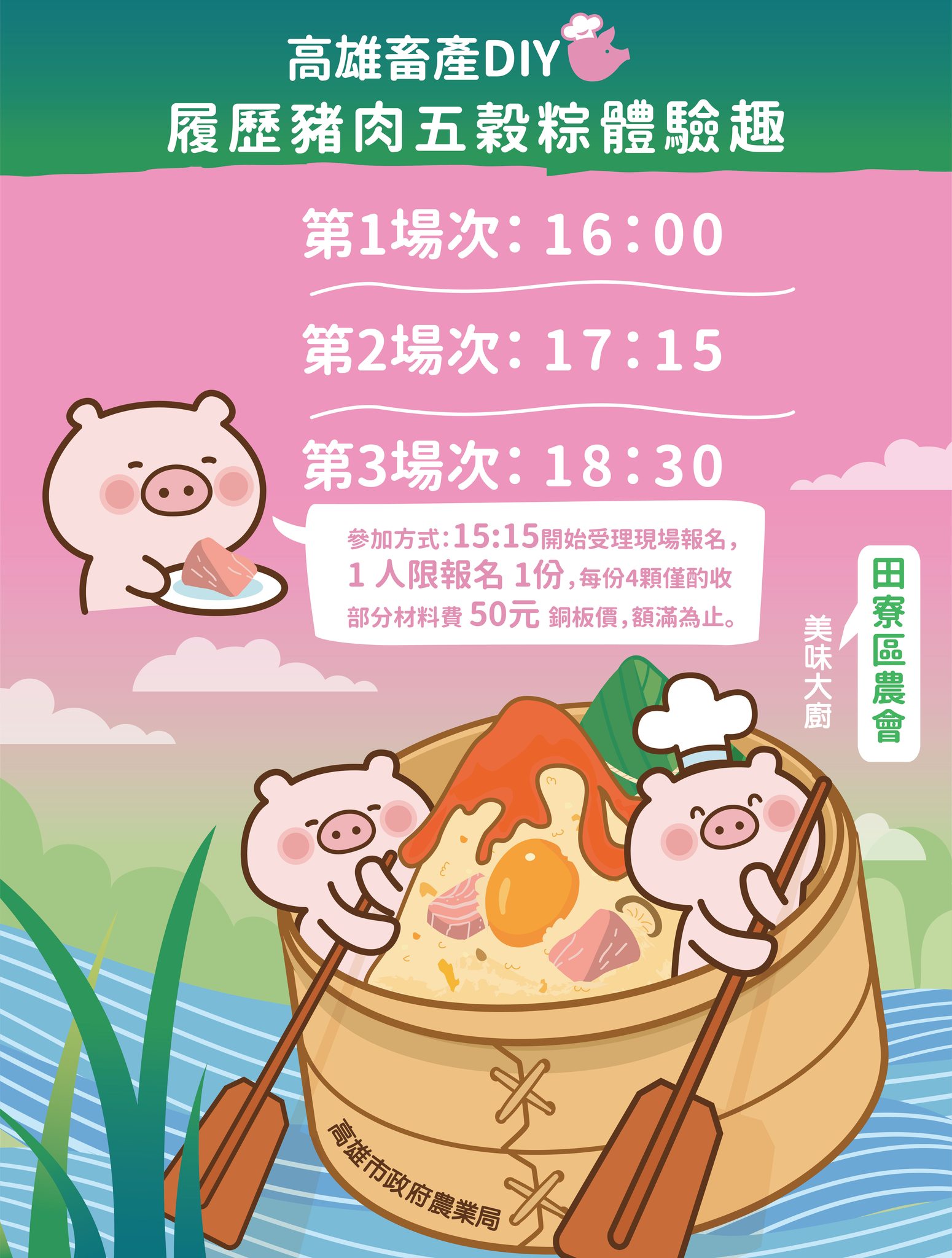 端午佳節將近,這次特別結合田寮區農會舉辦「高雄畜產DIY-履歷豬肉五穀粽體驗趣」,嚴選高雄在地優質豬肉,在農會家政班媽媽的引導下,親手包出健康美味的粽子,只要銅板價50元,就可以感受傳統節慶與在地畜產的魅力。包肉粽體驗趣採現場報名,名額有限,每日3場次額滿為止。