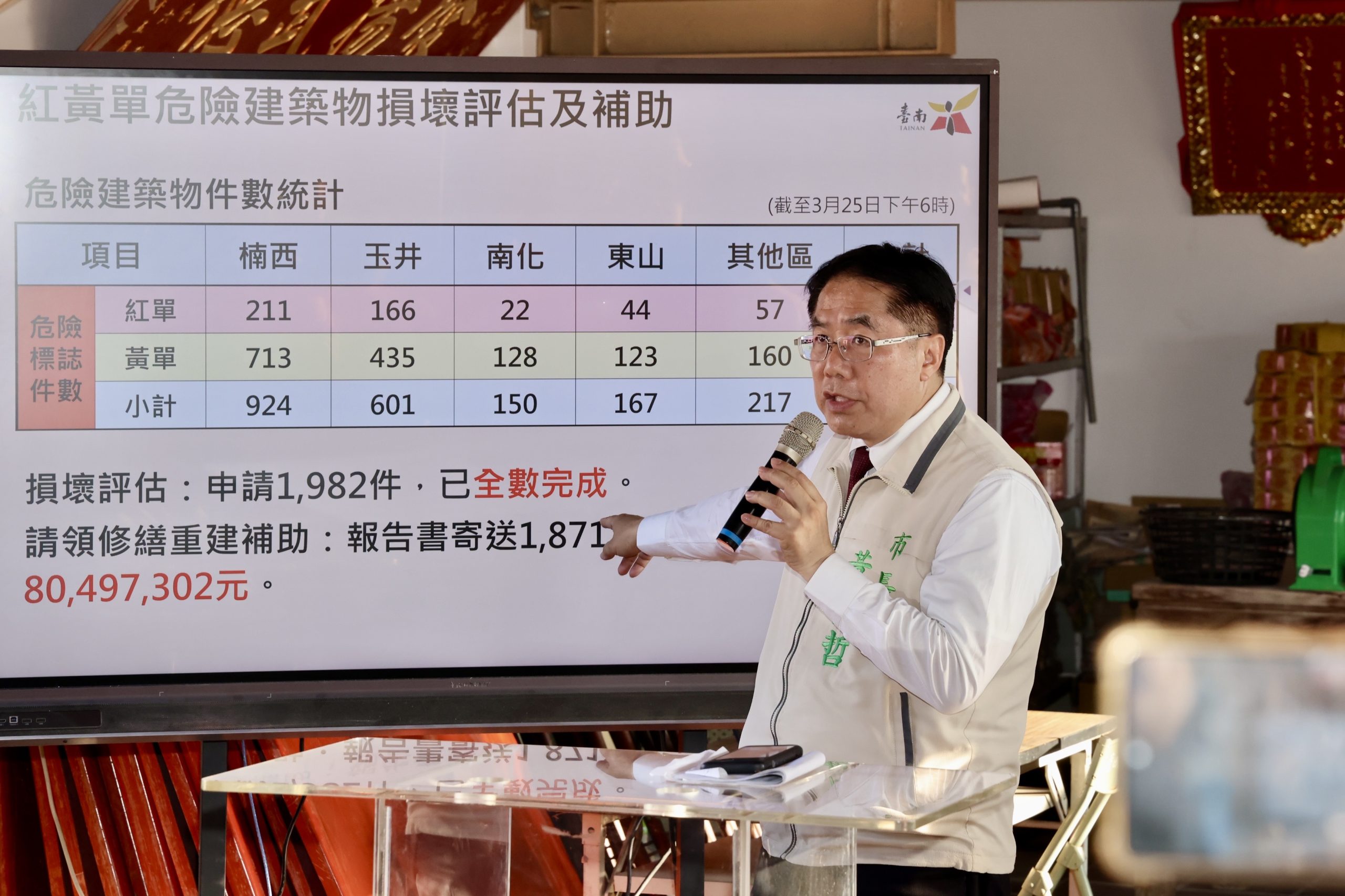 臺南市長黃偉哲表示,市府為求時效,許多補助已先行由市府經費墊支,後續仍需中央的大力支持,才能讓各項重建工作順利推動。希望中央持續加快經費核定流程,讓受災民眾、歷史文化資產、農業產業及地方經濟能夠儘速恢復元氣,迎接重建後的新生活。