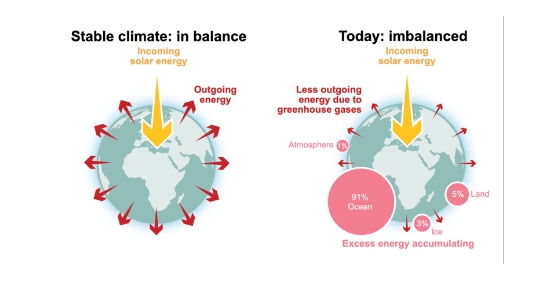 2026年3月23日世界氣象組織發布《2025年全球氣候狀況》報告,首度在年度報告中納入「能量失衡」概念,也就是太陽能量輻射進入地球後,地球卻散熱不了全部,長期累積下來地球就像一個壓力鍋,而90%的多餘熱能都由海洋吸收,因此過去20年來海洋變暖速度已逾1倍以上,海洋變暖會造成深遠影響,除會損害海洋生物外,也會因吸收過多熱而變得更加酸化,還會助長熱帶風暴,並導致海平面上升以及一連串的連鎖反應。