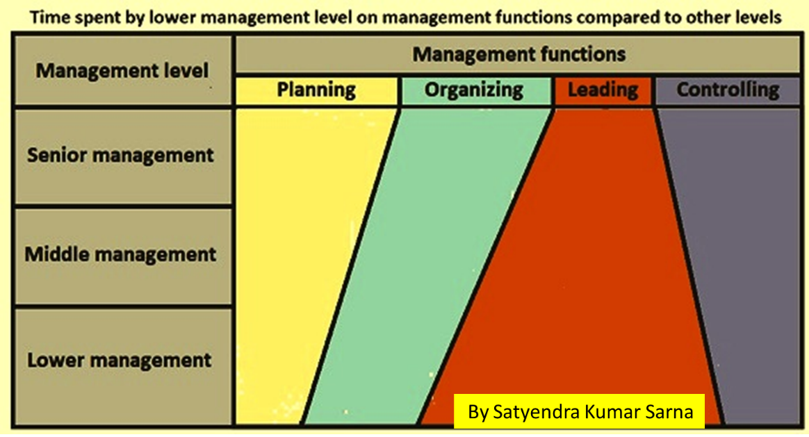 上第二圖則表明;不同管理層級(高階;中階;基層);在執行不同管理功能時 (Planning;Organizing;Leading;Congrolling),所該分配的時間,也該不同!