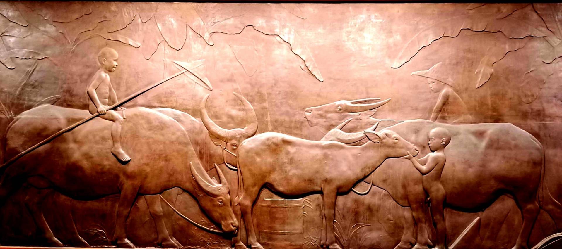 〈水牛群像〉是高250公分,長520公分的巨大浮雕,雕刻的水牛二公二母一小,牧童二個騎母牛,一個戴竹笠,一個拿竹竿撐玩竹笠,站在地上的牧童雙手握著小牛的嘴。