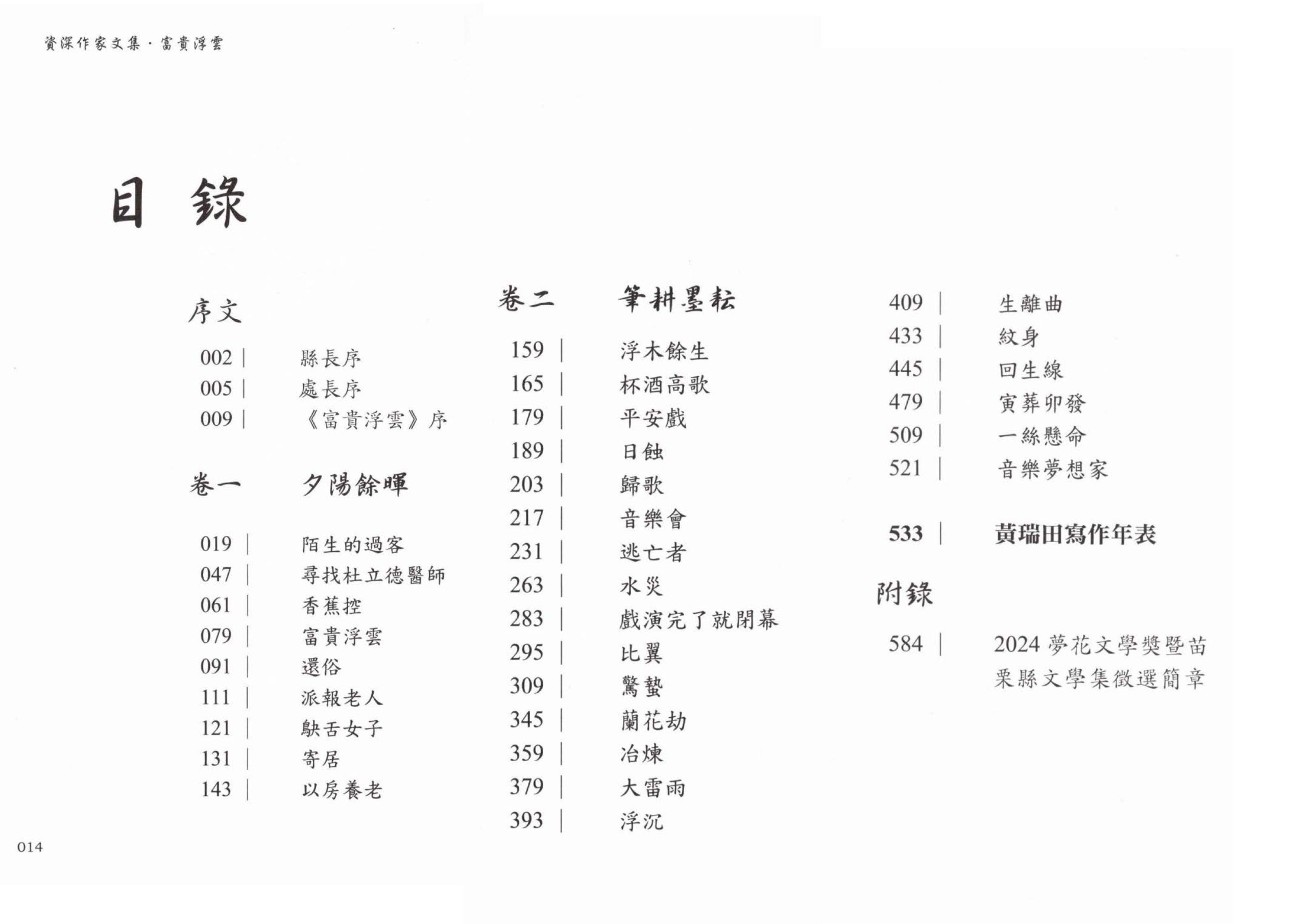 《富貴浮雲》也是小說集,共收錄30篇短篇小說,分二卷,卷一〈夕陽餘暉〉,卷二〈筆耕墨耘〉。
