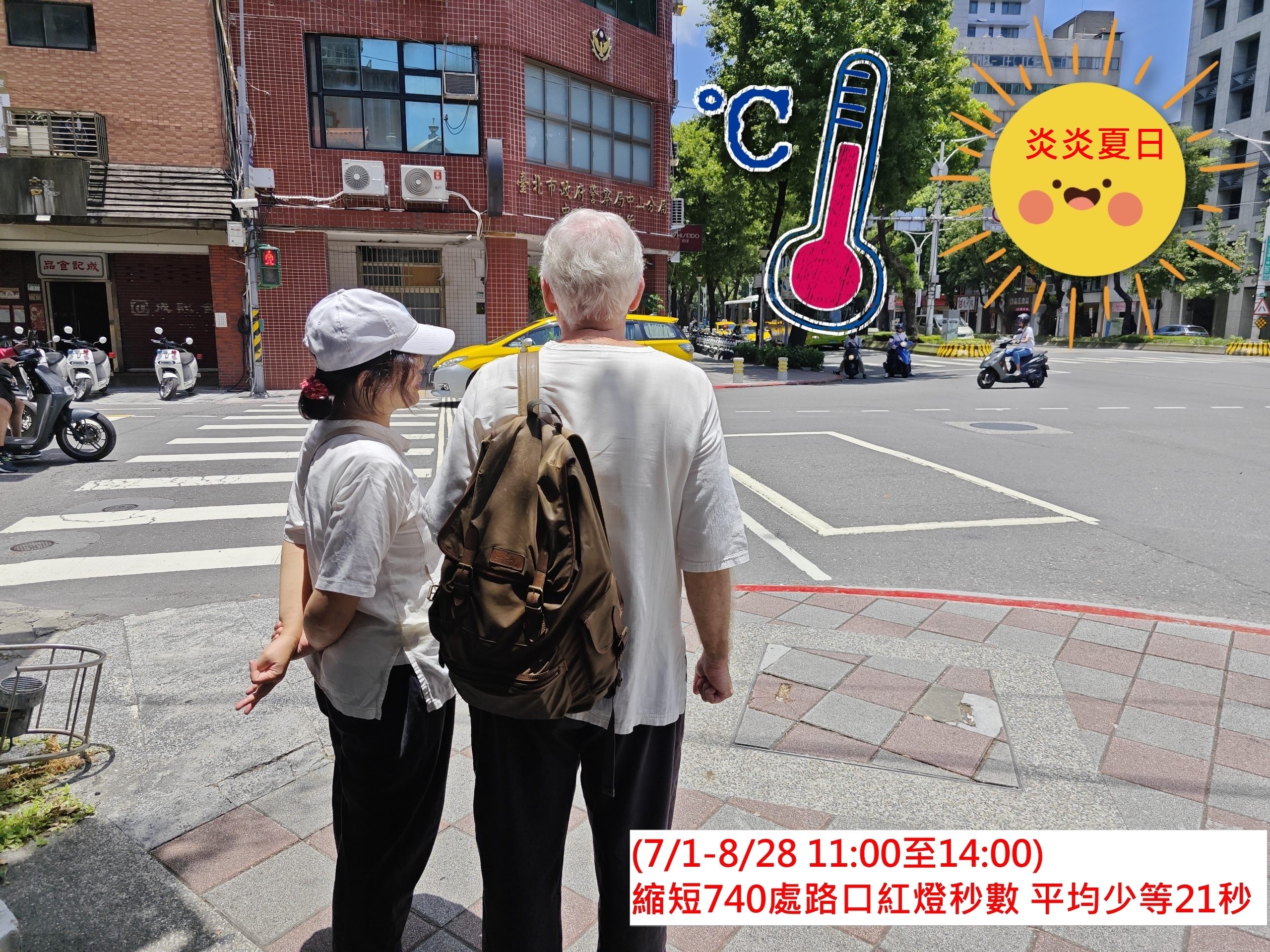臺北市位處盆地,容易蓄熱和不易散熱,導致部分區域形成高溫中心,同時高溫環境暴露可能導致熱危害,為因應高溫可能造成的熱危害,北市府積極發展降溫作為,包括串聯10大局處啟動熱浪預警機制,執行高溫應變,全面守護市民健康並同時推動創儲節能設備補助(建物隔熱膜及低收入戶節能家電汰換);以體感降溫2℃為目標,透過水綠降溫、建築節能等多元策略,讓城市更涼爽宜居;打造涼爽遊戲空間,在中正萬華、東區商圈等四大熱區增加綠覆率,以提升市民步行與活動空間的舒適度;縮短紅燈停等時間,優化740處路口號誌,平均縮短21秒等候時間,有效減少市民烈日下的曝曬。
