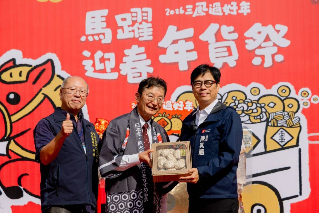 高雄年度農曆年節重頭戲「2026高雄過好年」首場活動,今(31)日由三鳳中街「馬躍迎春年貨祭」率先登場!市長陳其邁親臨現場,首度發放冬日遊樂園聯名IP馬年小紅包,提前與市民拜早年,洋溢濃厚年節氛圍。此外,今年活動更結合國際交流,特別邀請「日本台灣交流協會高雄事務所」奧正史所長與「全國椎茸商業協同組合連合會」鈴木雅雄社長代表蒞臨,現場特別準備日本產原木栽培乾香菇向台灣朋友分享,讓高雄最具盛名的經典年貨大街,再添台日文化交流的驚喜火花。