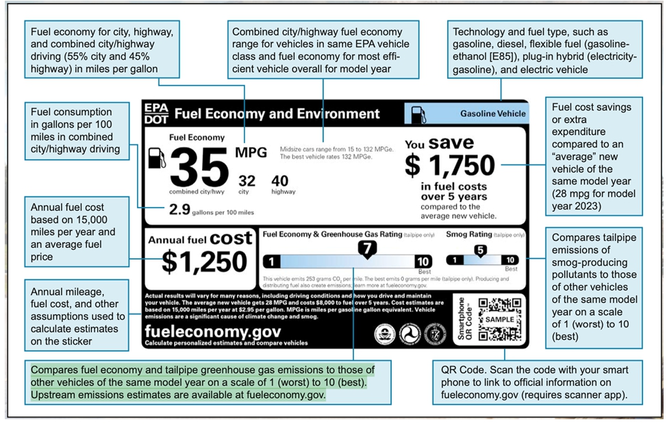 2023年1月12日美國聯邦能源局(DOE)和環保署(EPA)聯合出版的〈燃油經濟為您省錢〉報告指出:美國家庭支出的五分之一用於「交通」,使交通成為僅次於「住房」的第二大的家庭支出。如家家戶戶選用省油的車輛,則不但可減碳,每年還可下成千上萬美元的燃料錢。然因聯邦政府不能限制人們進口任何汽機車等交通工具,所以出版了「燃油經濟」詳細列出報全球所有車輛的耗油量,及各類型汽、柴油引擎的排空污碳量,以供民眾參考比較各類型車引擎內燃機的耗油成本,同時可比較全國各地的油價,以及在城市和高速公路百分比的駕駛條件,以獲得準確的車輛耗燃料,為民眾省錢參考,兼顧空污。報告中指出,目前在美國城市和高速公路上行駛的車輛,占美國溫室氣體碳排放量的23%,相當於1,400,000,000(14億)噸的碳排放量。目前在美國銷售的新車,年均碳排放量約5至9噸的溫室氣體,開車族如能將耗油量20MPG(Miles Per Gallon)的車輛,換成耗油量25MPG的車輛,車主每年不但可為溫室氣體減碳1.7噸,同時省下車主荷包的美元。