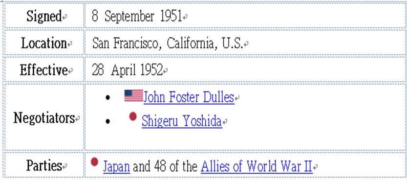 1951年9月8日,52國代表齊聚在舊金山歌劇院舉行《對日和約》儀式,後來有4個國家退出,吉田發表堪稱歷史性的日本「恢復獨立宣言」,原本要用英語,美國官員建議改為日語,吉田的助理急急忙忙更換為日語稿。會議結束後,吉田回到旅社,發現美國國務卿艾奇遜送來一盒頂級雪茄,令吉田感激涕零。不過,蘇聯代表葛羅米柯極為不滿,隔日嚴厲譴責《舊金山和約》未將台澎歸還給中國,剝奪了中國應有的權利。兩個中國政府均沒有參加,和約上沒有「中國」代表簽字。究其原因,答案就是出席和約的美國全權代表:杜勒斯。