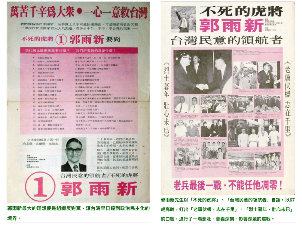 三年後的1975年,67高齡而以「不死的虎將」自況的郭雨新,又披上戰袍參選第一選區第二次增額立法委員(選區包括宜蘭縣、台北縣、台北市及基隆市)。