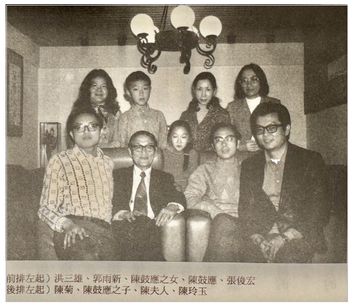 行前,我在自家作東擺了幾道小菜,為郭雨新餞行,作陪的有張俊宏、陳菊及陳鼓應全家福。當時,我也同樣被國民黨政府禁止出境,感同身受之餘,特別為他能踏出國門成為自由身感到高興。