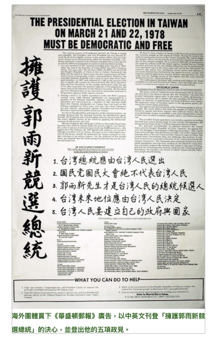 同年2月30日,由全球台僑團體聯名,在《The Washington Post華盛頓郵報》買下半版廣告,刊登郭雨新競選總統的廣告,其中有五點訴求,清楚表達了在國民黨一黨專制統治下,台灣人的政治心聲: