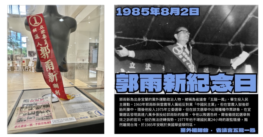郭雨新(1908~1985)是宜蘭出生的民主先行者。1948年他棄商從政,加入「中國青年黨」,那時台灣的政治環境是:「國民黨」一黨獨大,其他政黨不過是花瓶!1949年他獲遴選擔任台灣省參議會參議員,1951年以最高票當選台灣省第一屆臨時省議會議員,此後連續當選四屆宜蘭地區的省議員至1971年,前後長達22年。