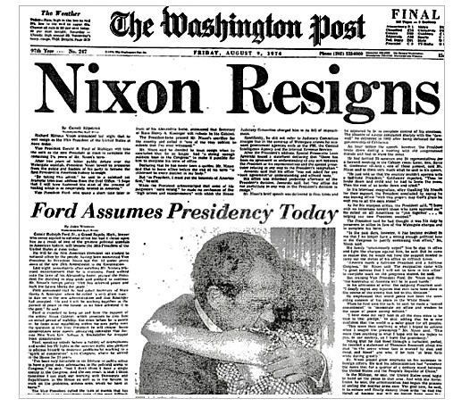 1974年8月8日晚,尼克森在白宮隋圓形辦公室,發表「辭職聲明」。隔天(8月9日)早上,辭職正式生效,他也從此「退出政壇」。這是美國史上,因以卑劣不法手段竊聽、攻擊政敵,招致大規模司法追究和承受最嚴峻政治責任的第一個案例。