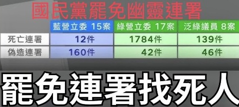 「中國」國民黨對付民進黨而「以罷制罷」的罷免連署竟然作弊,捨正途而不為,以致罷免17位綠委竟有高達1,784位死人的「幽靈連署」,被發現而遭移送法辦後,主其事者有的羈押禁見、有的交保、有的無保請回。對「中國」國民黨而言,長年以來選舉舞弊乃司空見慣的平常事,誠如其立委賴士葆所言:「偽造文書有這麼嚴重嗎」?