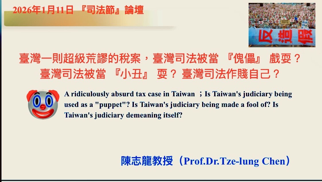 陳志龍教授(Prof.Dr.Tze-lung Chen)初次發表於2026年1月11日 『司法節』論壇:臺灣一則超級荒謬的稅案,臺灣司法被當 『傀儡』 戲耍?臺灣司法被當 『小丑』 耍?臺灣司法作賤自己?
