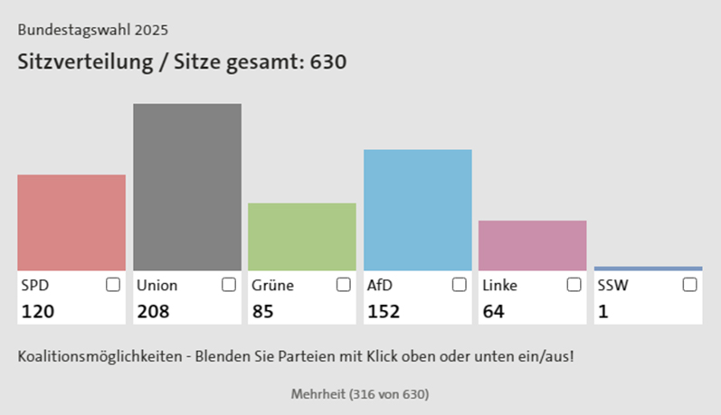 昨天下午我還在擔憂,但今天早上聯邦議會席位呈現:社民黨(紅)120席,聯盟黨(黑)208席,綠黨(Grüne)85席,選擇黨(AfD)152席,左翼黨(Linke)64席等。聯邦議會此次席位合計630,超過一半316席就可組成政府內閣。顯然聯盟黨和社民黨組閣已經過半(328席),當然倘若聯盟黨與選擇黨組閣,同樣過半(360席)。關鍵是聯盟黨主席默茨(Friedrich Merz)選前承諾:「排除與選擇黨合作」,也就是說,從選舉現實情況來看,黑紅組閣已經毫無懸念。