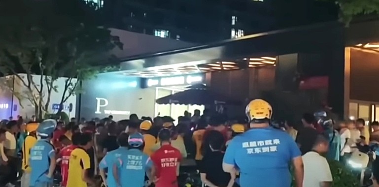 無獨有偶,8月10日晚間,上海浦東臨港新片區滴水湖畔的中建玖海雲天小區,因物業管理部門裡出台新規定,禁止外賣騎手騎行電動車進入社區,所有外賣必須步行派送。騎手們質疑該規定不公平且無視於外賣騎手之工作負擔,特別是酷暑期間已有騎手中暑暈倒,因而有200多名來自美團、餓了麼、京東等不同外賣業者之騎手前來社區聲援外賣員與社區保安的衝突現場,警方亦到場維持秩序,在試圖強勢逮捕一名外賣員後,警車遭到群眾包圍而無法離開。凌晨,群眾與社區物業終於達成協議,社區允許騎手以不超過每小時25公里的速度騎車進入社區送餐。之後,抗議群眾方才陸續散去。