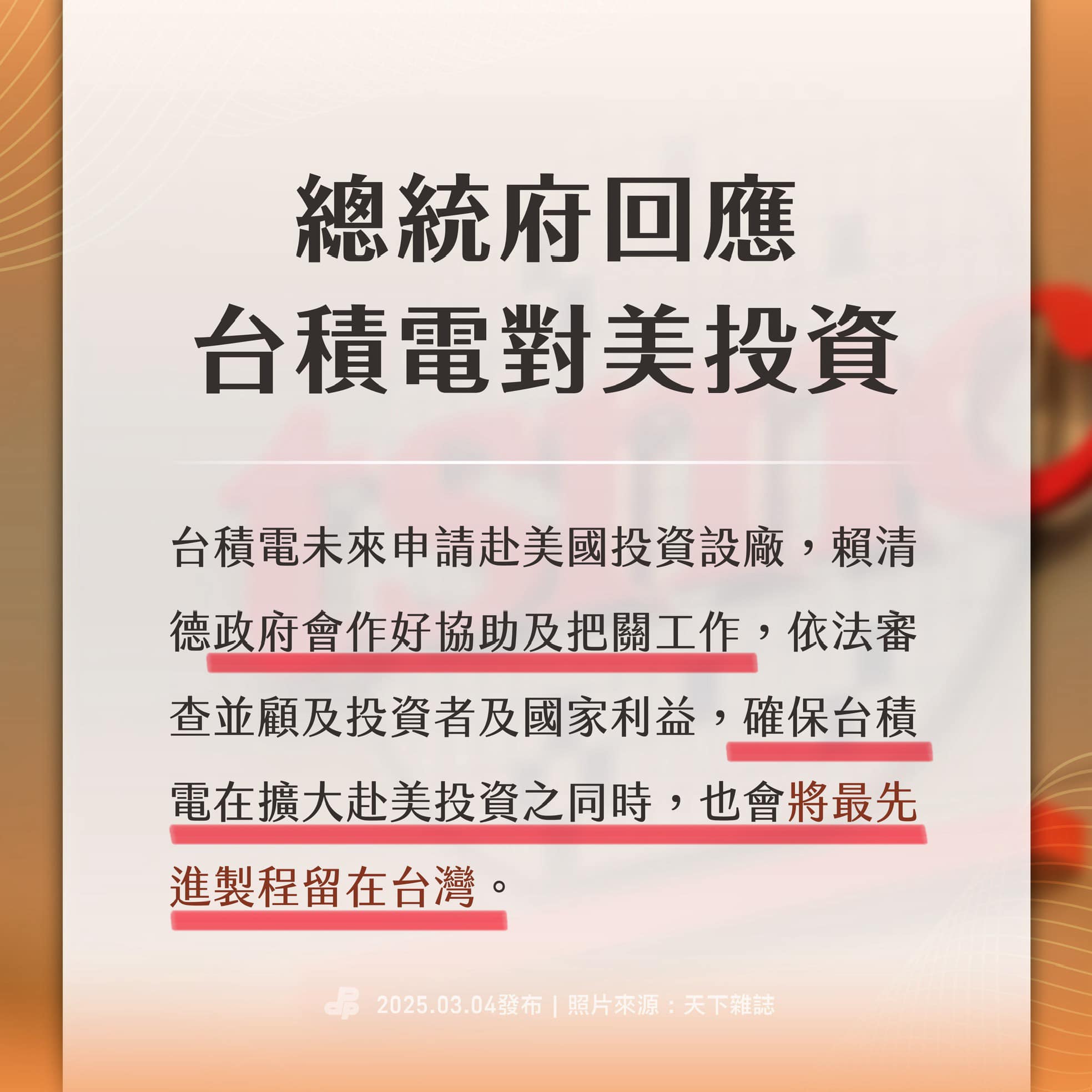 台積電加碼投資美國的新聞出來後,總統府回應:「政府會做好協助及把關工作⋯⋯,確保台積電赴美投資之同時,也會將最先進製程留在台灣。」(附圖)