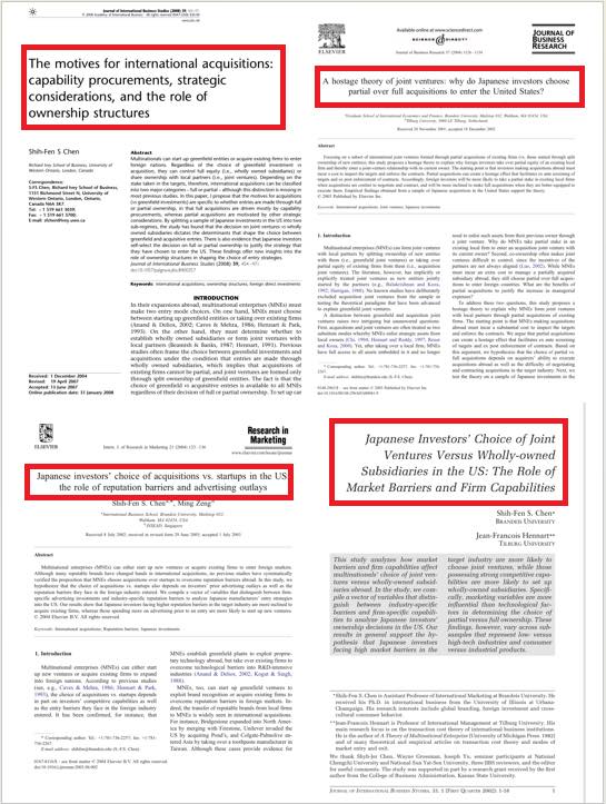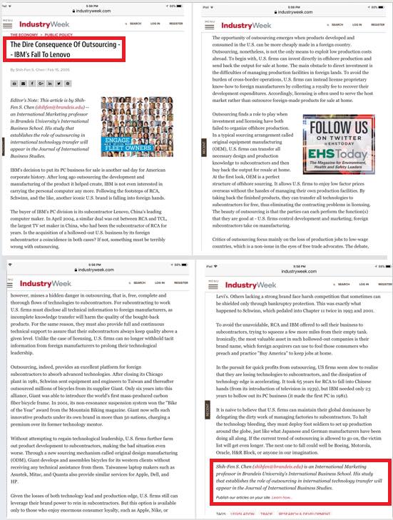 早在2005年,我就在美國的產業週刊發表專論,闡述外部生產對技術流失的影響(附圖)。針對日本企業在美國的投資,我在頂級期刊發表多篇實證研究論文(附圖)。