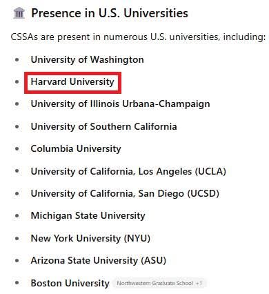 事實上,CSSA不是哈佛校園才有的組織。只要是有大量中國留學生的美國大學,就有CSSA的分會,附圖三只是名單的一部份。思想坦克的文章把CSSA的帳掛在哈佛身上,讓我感到不解。