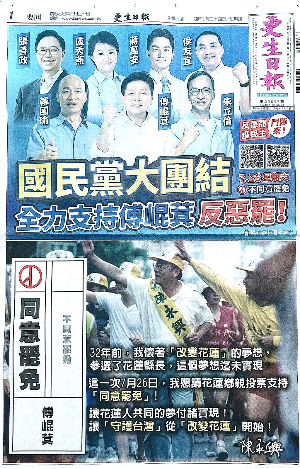 面對國際事務,國會的權力大於總統府,請問,到底是立法權當家鬧事,還是行政權當家鬧事?老韓是北大高材生,他被高雄人罷免,當時喊高雄大發財騙到選票,現在高雄人以罷免成功作為光榮標誌,可是,政客不死,還活出滋潤,老韓被國民黨重用,一步登天,配合傅崑萁搞出國會擴權政變的大事,今天如果國會議長態度中立,只有傅崑萁演不出大戲,台灣人要清楚,有首謀必有共犯,不用大罷免運動,不足以解決國會的弊端問題,還好,感謝公民團體跳出來,又一次給台灣人機會,你只要投下同意罷免票,就可以讓台灣國會重新開機,讓真心愛台灣的人帶領台灣。