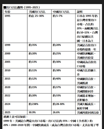 台灣在2025年的出口市場中,美國超越中國成為第一大出口國,主要原因是AI與半導體需求激增,加上地緣政治與供應鏈重組,使台灣對美出口快速成長,而對中出口則因為軍事壓力與市場風險下降。在1990年代,台灣出口結構是以美國、日本為主,1995年美國是台灣首位出口市場的最後一年,直到2025年,美國又回復為台灣首位出口市場。