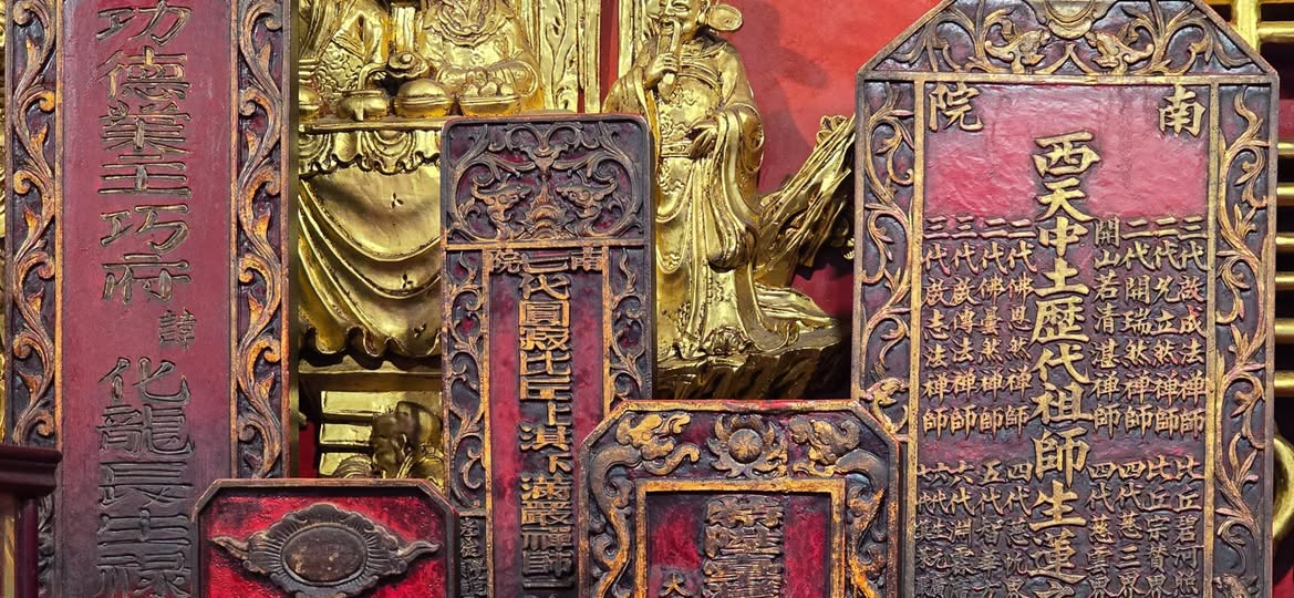 有一座標題為「西天中土歷代祖師生蓮位」的神主牌位,記載自西天傳入漢地的佛教祖師傳承,並延續至鎮瀾宮的主持系統,展現一條清晰的弘法脈絡。