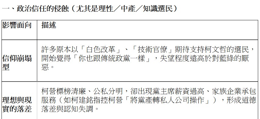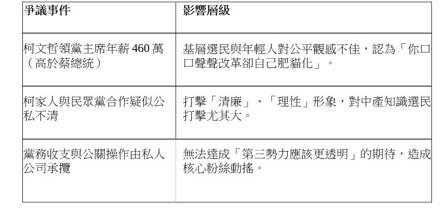 柯文哲與民眾黨在崛起過程中強調「白色力量」、「反貪腐」、「公開透明」,吸引大量厭倦藍綠惡鬥的年輕選民。然而,隨著其遭遇「政治獻金、用人爭議、政黨財務不透明」等批評,被質疑「公私不分、金錢政治」,已開始對其支持者造成以下幾個明顯影響與動搖: