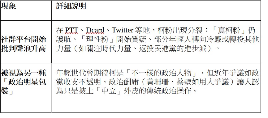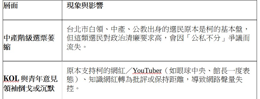 KOL與青年意見領袖倒戈或沉默 原本支持柯的網紅/YouTuber(如眼球中央、館長一度表態)、知識網紅轉為批評或保持距離,導致網路聲量失控。