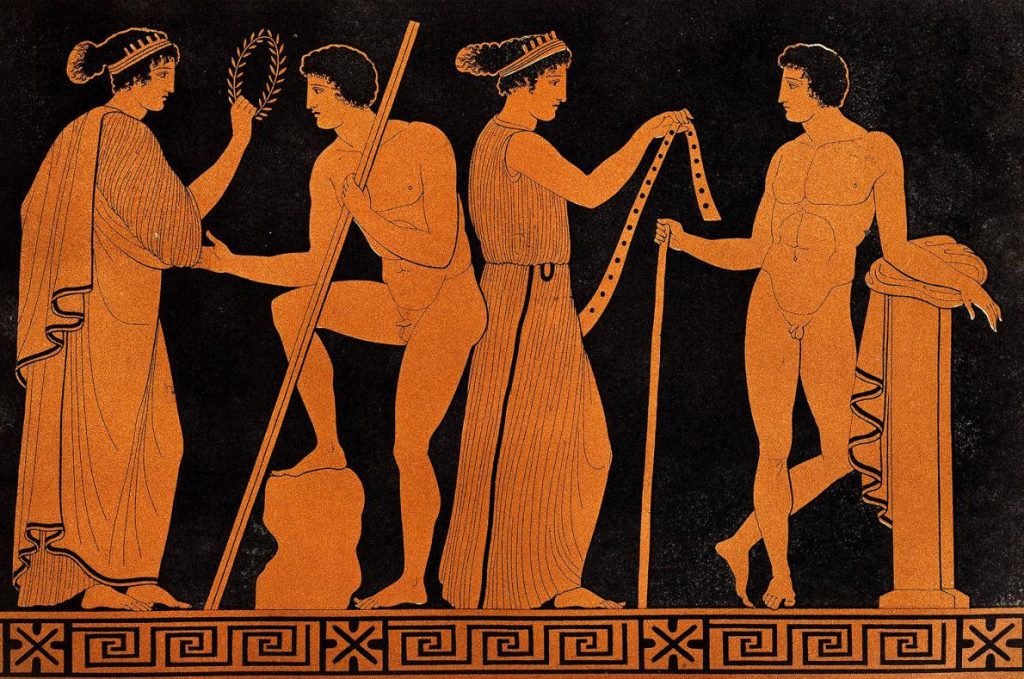 其次起源於公元前776年奧林匹亞的宗教與體育盛事,祭拜主神宙斯的重要宗教慶典,古希臘奧林匹克運動會,成為現代世界奧運會繼承其精神,在競技場上展現公平競爭的理想。希臘神話中的勝利女神Nike向奧運獲勝者獻上桂冠和披帶。