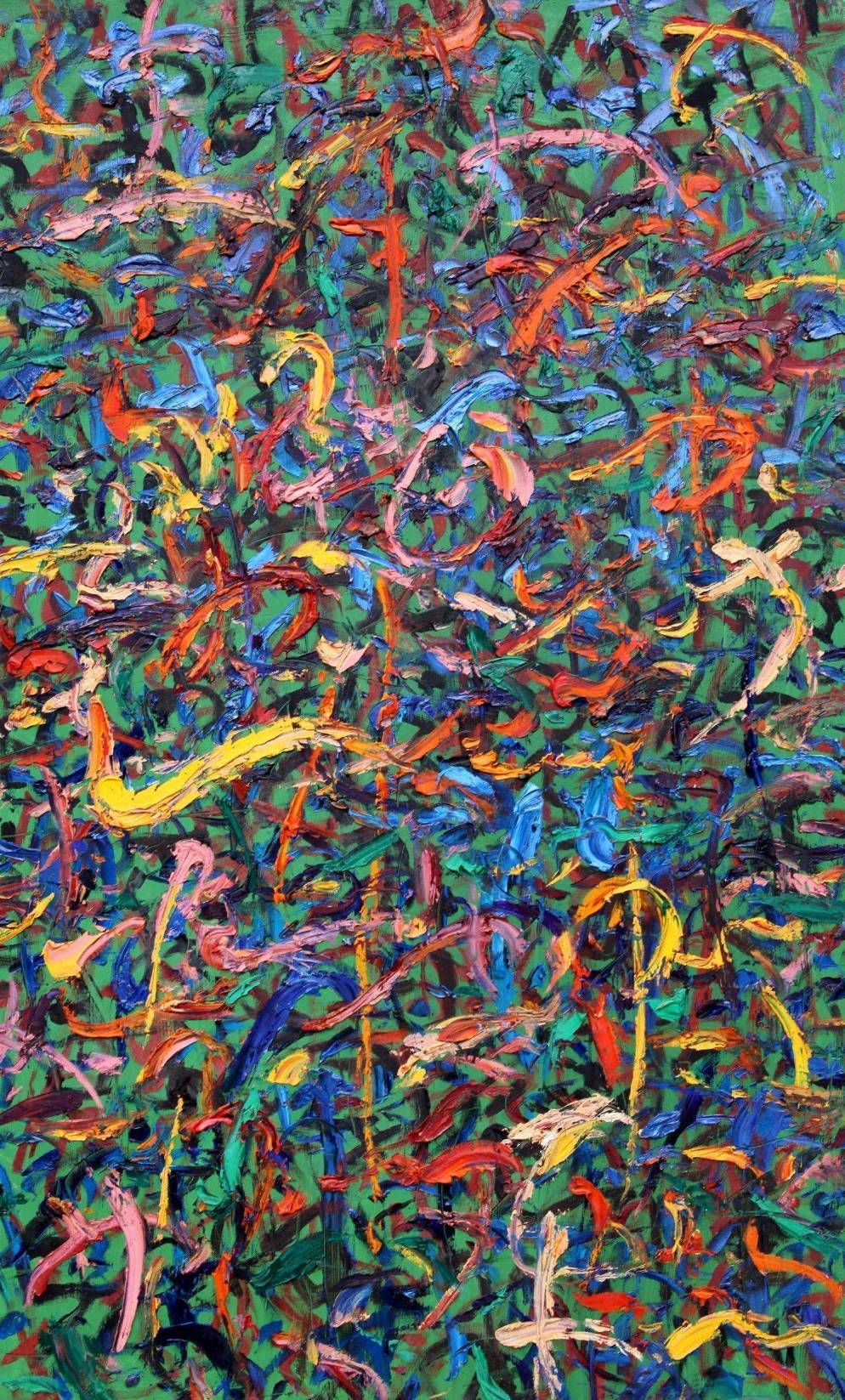 抽象畫以綠色鋪陳一片生命草原,許多自由線條飛舞,如草葉似花瓣,更像一絲一縷的生之遊魂,隨意翩飛,上下求索,穿透時空,浮潛意識。