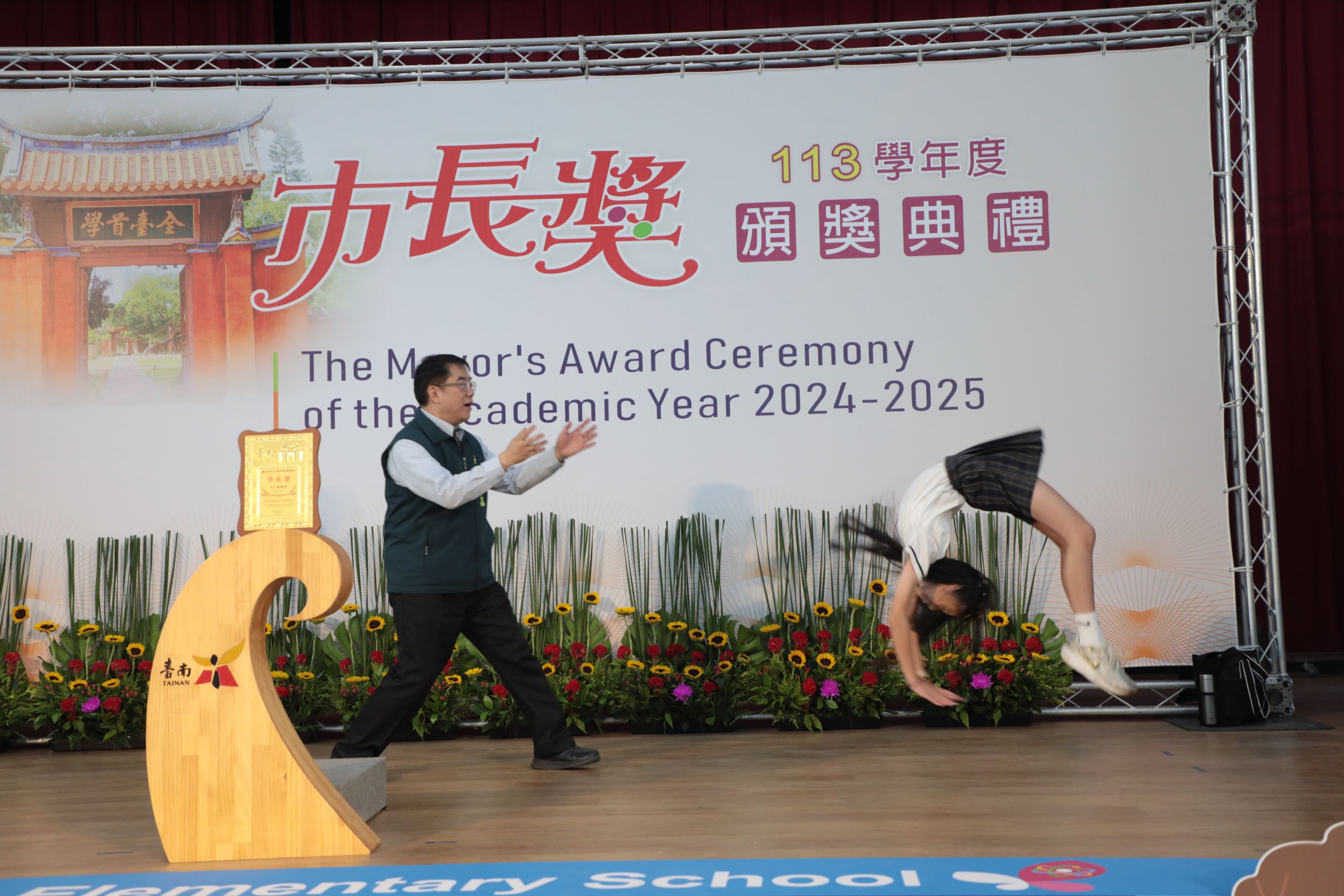 由台南首創、為中小學生涯留下獨一無二珍貴回憶的「市長陪你拍」市長獎頒獎典禮,第5場次今(24)日下午於新營國小舉行。市長黃偉哲親自出席,頒發來自新營區、下營區、大內區、山上區等24區、共124所國小的570位獲獎畢業生。現場學生發揮創意與市長合影,有人表演一字馬、後空翻,有人騎著單輪車登場,還有人帶來三叉戟、反曲弓等道具,充分展現個人特色,現場氣氛熱絡又溫馨,市議員蔡育輝,立委林俊憲、賴惠員服務處及各議員服務處代表皆到場獻上祝福。