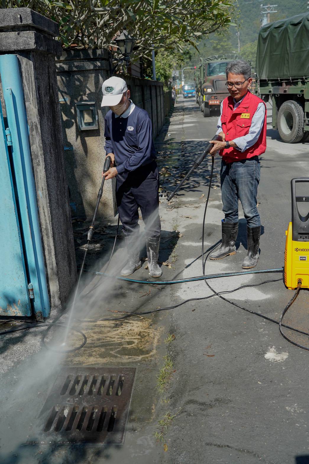 此外,內政部消防署也調度14台消防水車,搭配國軍跟慈濟志工進行清理,經濟部產發署昨日緊急購置的800套高壓噴水槍也在今晨運抵,200套於今日下午陸續送達,並由賴總協調官主持捐贈儀式,現場發送國軍、慈濟及光復鄉公所使用,提升清理效能。