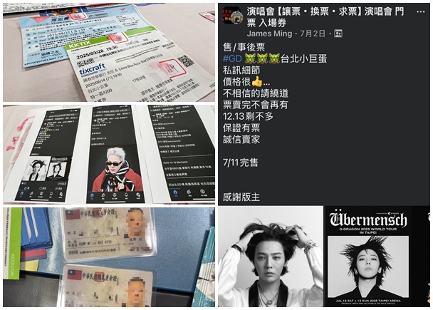 刑事局偵第一大隊日前網路巡邏發現,有賣家公開於社團平台販賣韓國藝人GD演唱會門票,並保證可通過實名制認證,該演唱會係於7月11日至13日舉辦,門票一開賣旋即搶購一空,黃牛坐地喊價,1張原價8,980元的VVIP門票開價至少5萬元,刑事局遂與臺北市及臺中市刑大共組專案小組並報請臺北地檢署指揮偵辦。警方循線逮捕柳姓男子等四名犯嫌,並查扣大量G-Dragon等演唱會兌票序號1,500組、實體演唱會門票44張、太妍演唱會粉絲福利品、偽造證件、演唱會手環、電腦主機、筆記型電腦、現金新臺幣(下同)16萬4,000元、彩色影印機、圓角器、護貝機、護貝紙及偽造身分證鋼印等證物。