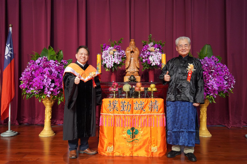 容繼業校長應邀回校為畢業生獻上祝福,為現場增添溫馨氣氛,而應屆畢業生正好是陳敦基校長就任之初入學,正逢COVID-19疫情蔓延全球,新生入學時,校園迎新、授課型態與校園生活皆受到衝擊,如今能以隆重典禮為大學生活畫下美好句點,校長感性以「敬」、「競」、「靜」來和畢業生分享,敬業:追求卓越,敬天:尊重大自然,敬人:勇於承擔;競爭,和自己競爭也和別人競爭,與時俱進,不斷提升自己;靜,寧靜致遠,淡定從容;最後以「塵起塵落緣自在 人來人去情永在」,祝福畢業生鵬程萬里!