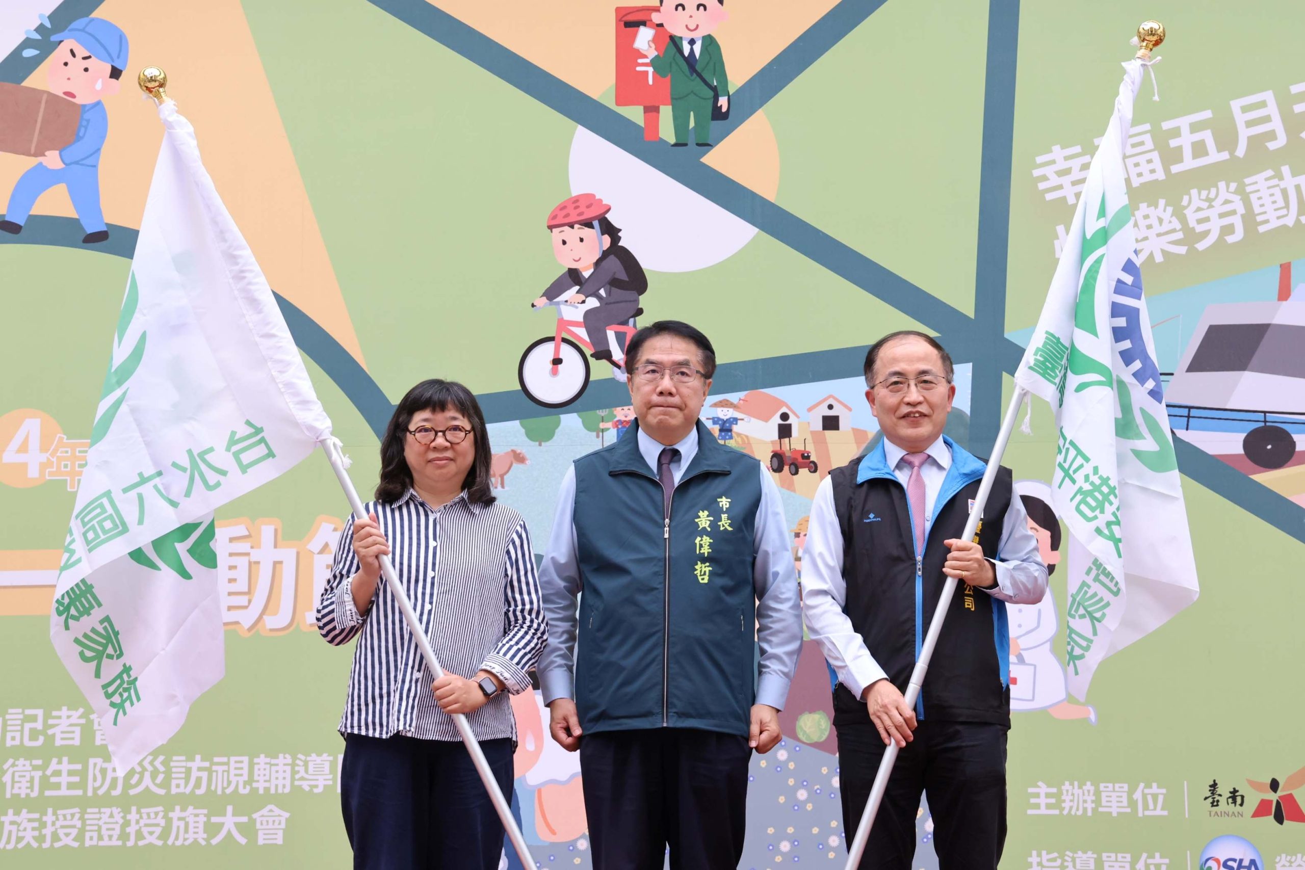 黃偉哲今日特別頒發感謝狀給前述的21家單位與提供「AI行銷導流平台」的ESGPB撇步網站,感謝單位對於勞動節系列活動的支持,同時也授旗給本年度新成立安衛家族的「台灣自來水公司第六區管理處」、「臺灣港務公司高雄港務分公司安平港營運處」等兩家核心企業,期望更多事業單位能落實職業安全衛生。