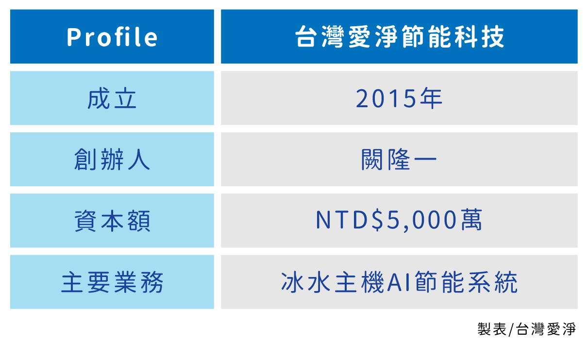 「台灣愛淨」創辦人闕隆一表示,市面上冰水主機廠牌眾多,各廠牌又有新舊年份的不同,有些不支援物聯網,無法蒐集數據。我們在舊系統加裝控制器,讓老舊機台的數據也能被讀取再分析和調控。任何廠牌的冰水主機、不論新舊,都能做到節能升級,這是台灣愛淨十年來下足苦功累積的技術能力。
