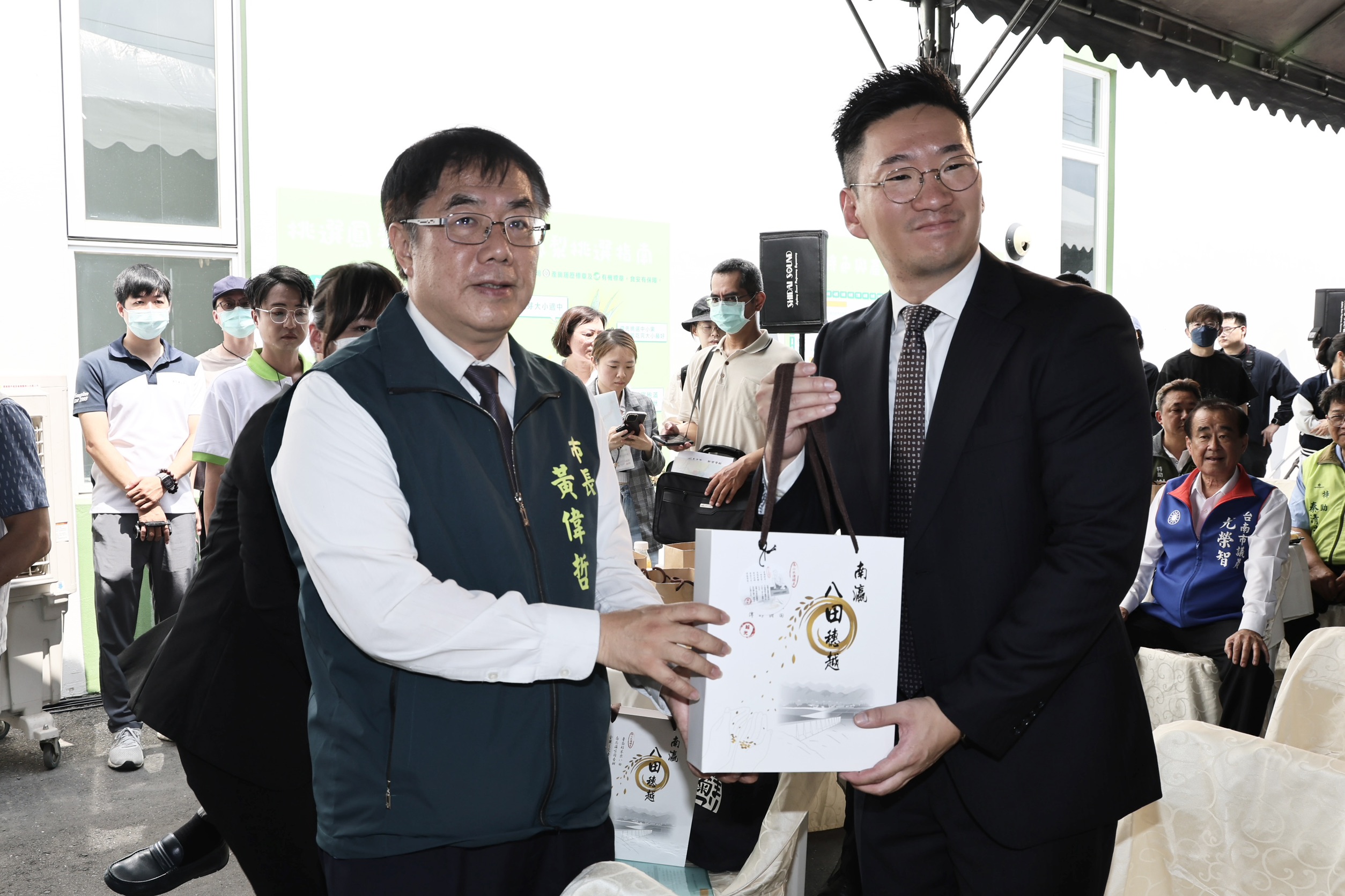 黃偉也趁機將今日上午才公開亮相的「八田穗越」八田米贈送給與會的茨城縣笠間市台北辦事處長坪井勇樹,感念八田與一技師對台南的貢獻,以及象徵台日友好。