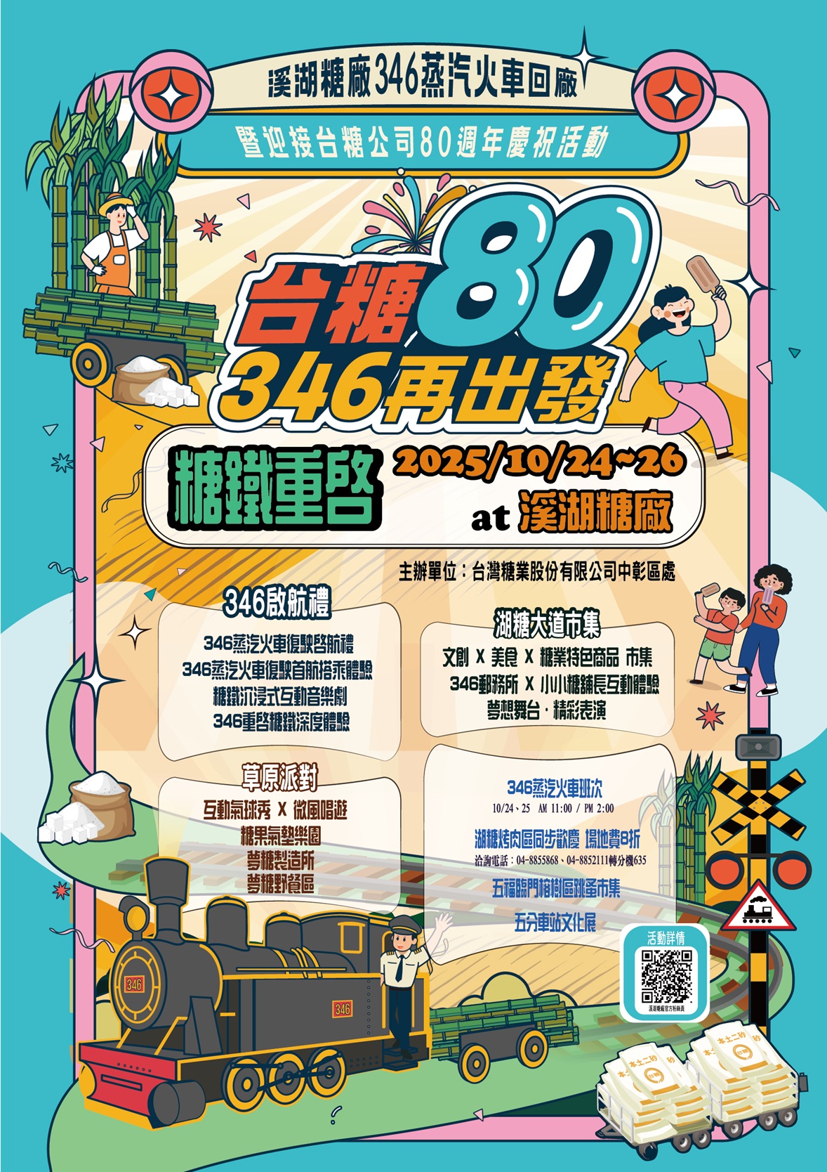 10月24日至26日「台糖80‧346再出發」系列活動將於溪湖糖廠盛大展開,活動內容除了346蒸汽五分車復駛外,還有融合糖鐵歷史與表演藝術的「蒸汽火車沉浸式音樂劇」、適合親子同樂及音樂演出的「草原派對」、讓小朋友模擬販售糖品的「小小糖鋪長體驗站」,匯聚地方美食、糖業特色及文創商品的「湖糖大道市集」,五分車車站並有展示346蒸汽五分車修復照片及相關文物,超過10萬零件組裝成的國寶機車頭,超高難度重回五分車軌,為台糖即將迎接成立80周年首掀高潮,後勢也藏有看頭。