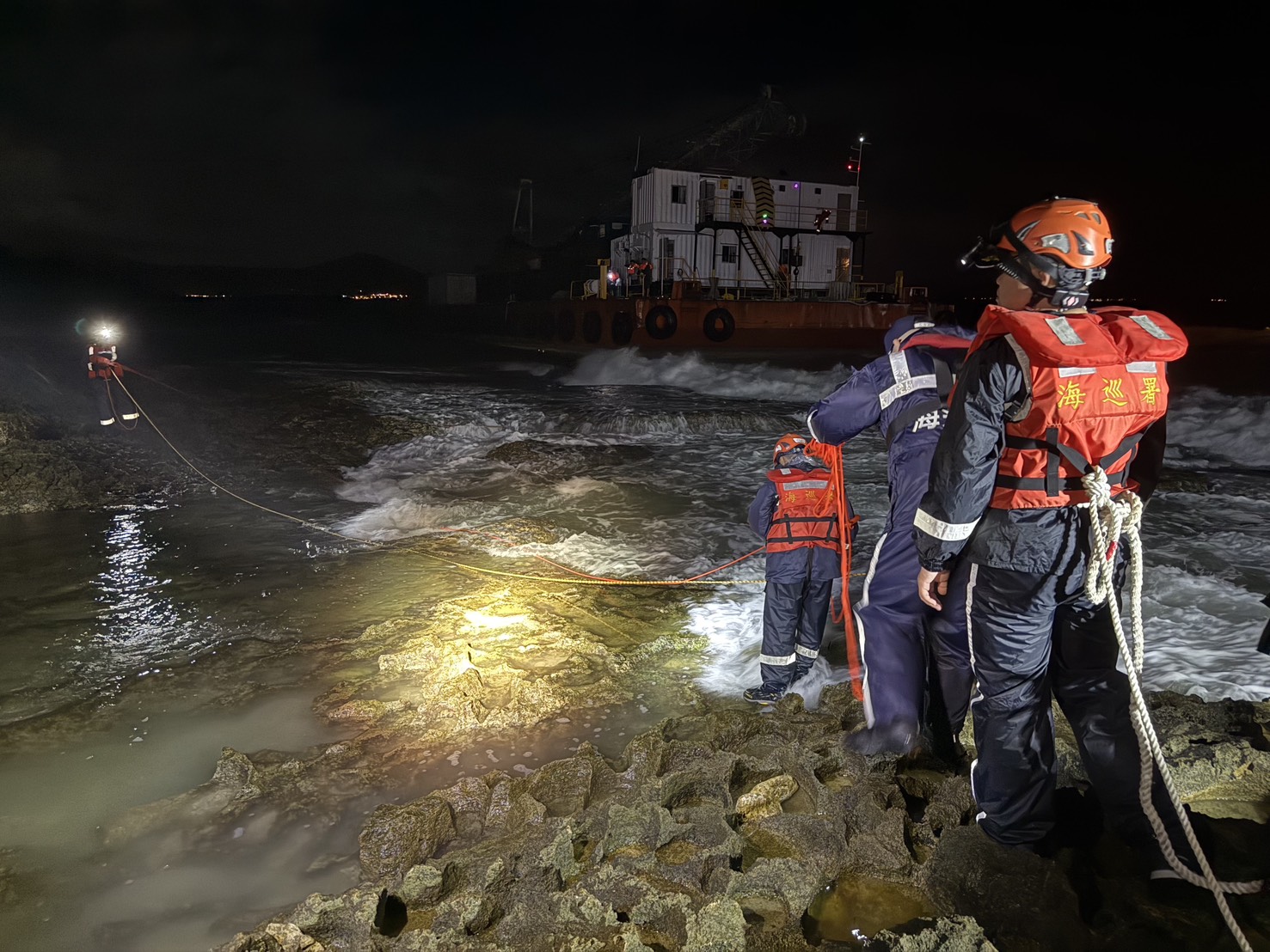 海巡署南部分署海巡署第六岸巡隊接獲通報後,隨即派員馳赴現場展開救援行動。因現場天氣惡劣,能見度不佳,伴有強降雨情形,救援人員不畏風雨,徒步攀爬礁岩並運用「捲線延伸式浮水繩」實施下水救援,逐一將工作平台上4名台籍船員,以人力接駁方式成功救援上岸,全程無人員傷亡,另拖船及工作平台則預計於(12)日拂曉時,由船公司委託港勤451號實施救援拖困。