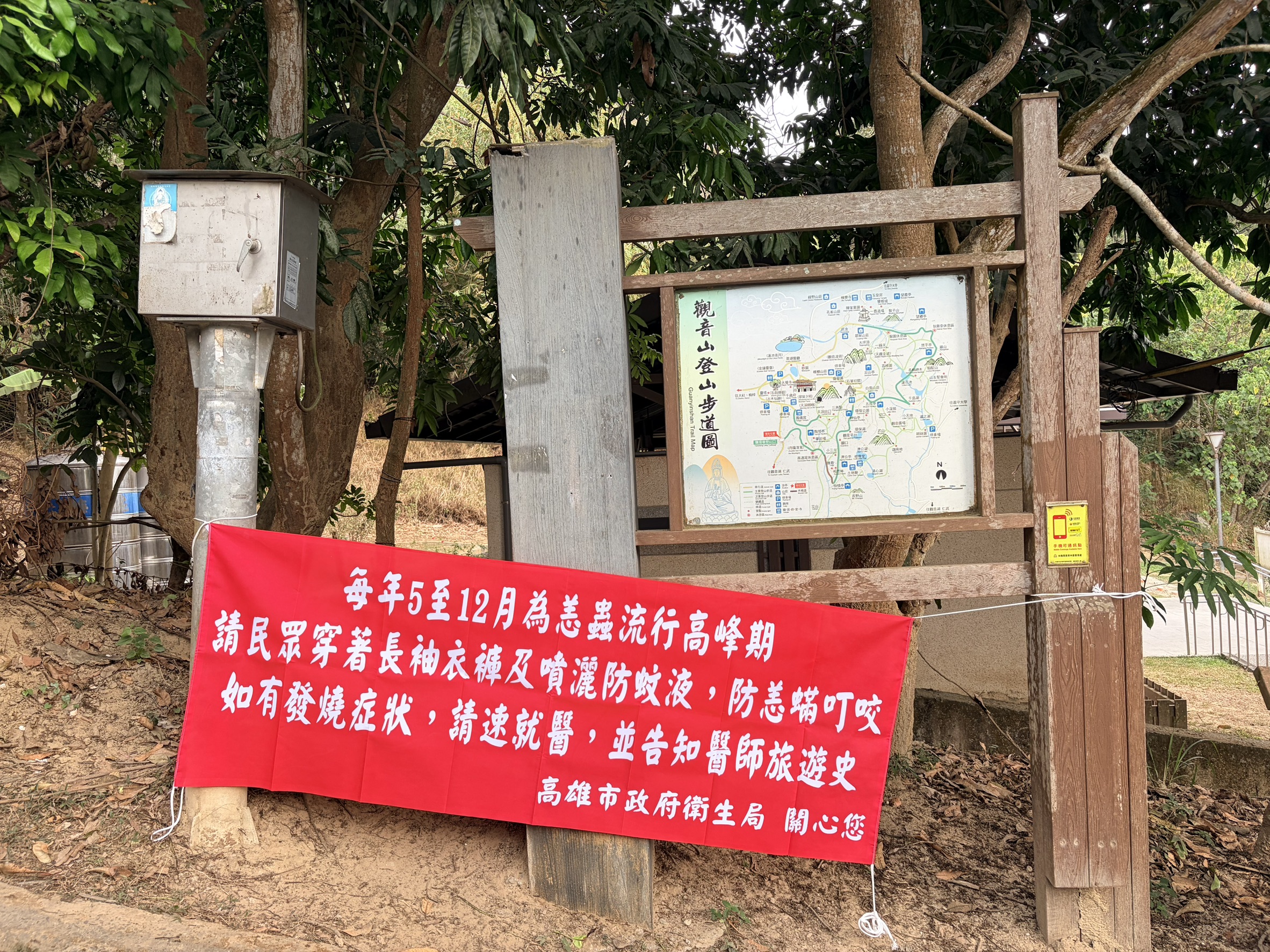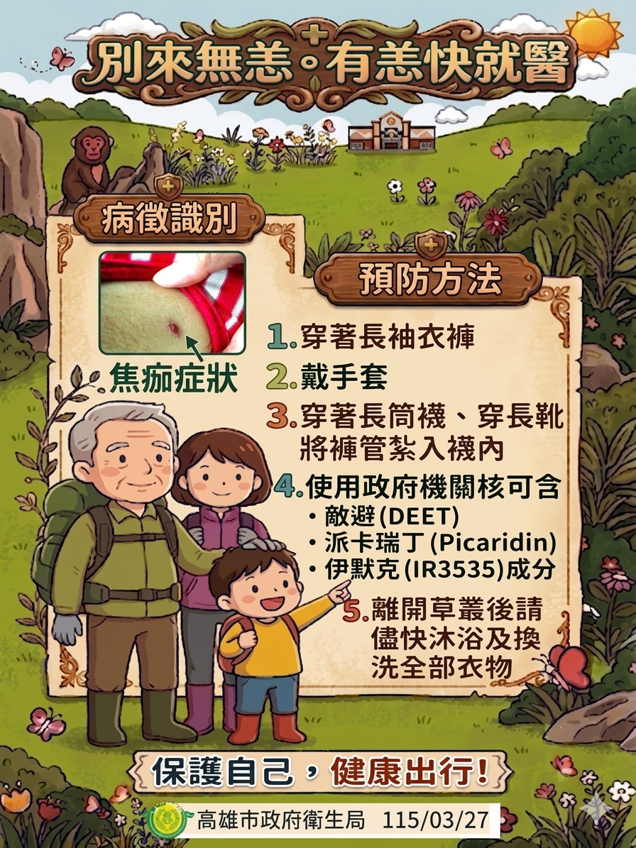 衛生局強調,恙蟲病是由帶有立克次體的恙蟎叮咬而傳染,恙蟎會停留於草叢中,伺機攀附到經過的人類或動物身上並叮咬。根據過往疫情監測資料,近郊山區為恙蟲較常出沒的熱點,為防範登山及掃墓民眾遭受恙蟎叮咬,衛生所也在柴山等熱門登山步道入口處懸掛紅布條宣導提醒,並放置防蚊液供民眾使用。
