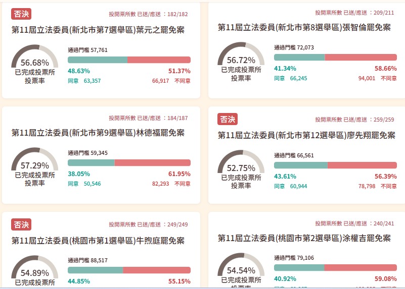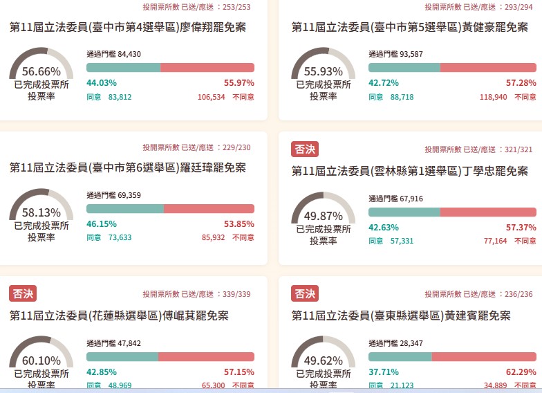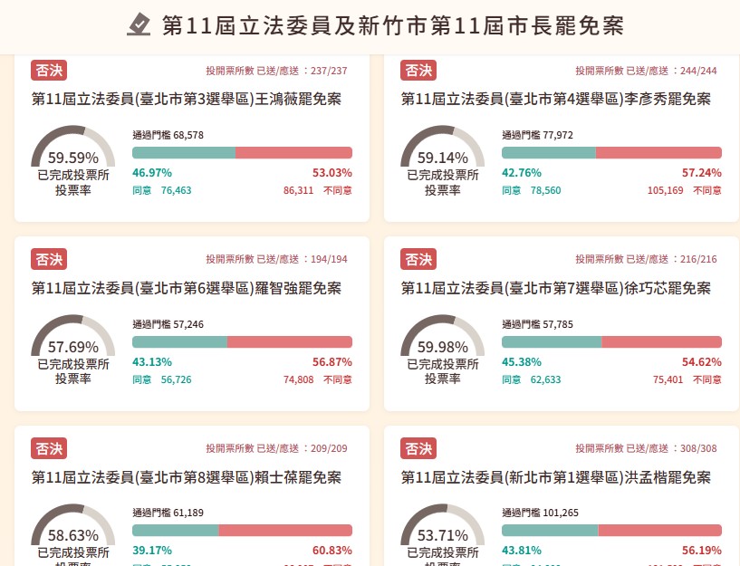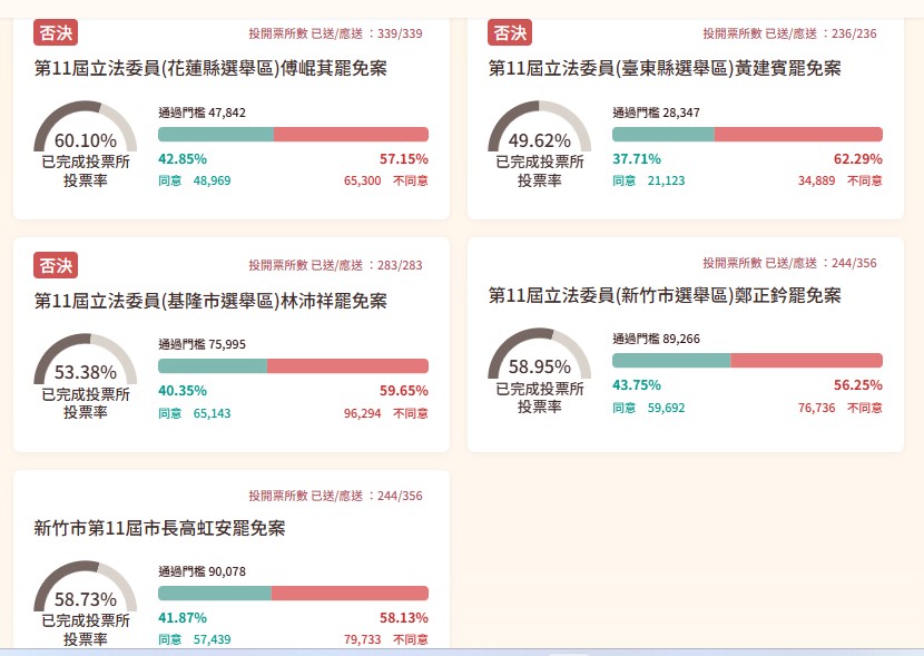 第11屆立法委員及新竹市市長罷免案今(26日)投開票,面臨罷免的包括國民黨立委傅崐萁、黃建賓、鄭正鈐、林沛祥、萬美玲、魯明哲、涂權吉、牛煦庭、廖先翔、羅廷瑋、黃健豪、廖偉翔、邱若華、呂玉玲、丁學忠、葉元之、王鴻薇、李彥秀、徐巧芯、賴士葆、羅智強、洪孟楷、張智倫、林德福,以及遭停職的新竹市長高虹安。根據中選會統計結果:25案全數否決。以下為投票統計: