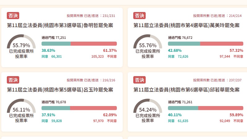 另外,中選會委員會議審定,國民黨立委羅明才、江啟臣、楊瓊瓔、顏寬恒、林思銘罷免案皆成案,8月23日投票。國民黨立委馬文君、游顥罷免案也在8月23日與核三重啟公投同日登場。