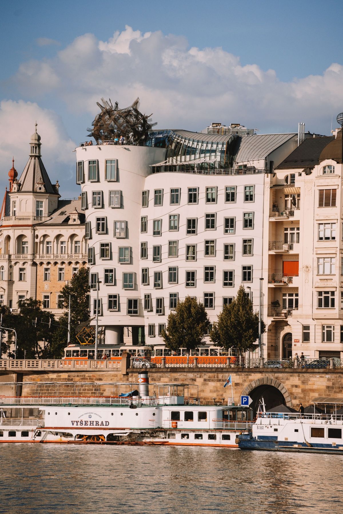 《會跳舞的房子》(Dancing House)坐落於伏爾塔瓦河畔,與鄰近的新古典與哥德建築形成強烈對比,外牆的玻璃塔猶如優雅女舞者向內傾斜,與旁側曲線鋼筋水泥的「男伴」相互輝映,兩者之間不僅是形式互動也能共舞。建築不再被視為單一功能的封閉型體,而是一場開放表演,邀請城市居民共同參與。