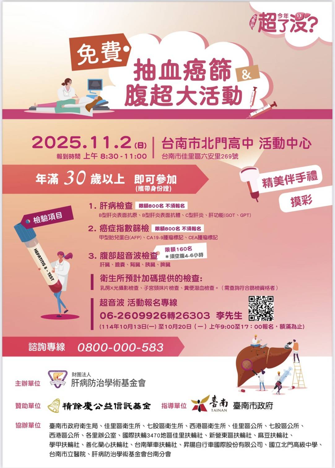 積餘慶公益信託基金成立後,即將於114年11月2日上午8時30分至11時於台南市佳里區北門高中活動中心,邀請財團法人肝病防治基金會舉辦免費抽血癌篩大活動,包含肝病檢查,癌症指數篩檢及腹部超音波,年滿30歲以上即可報名參加,並贈送精美伴手禮及摸彩活動。